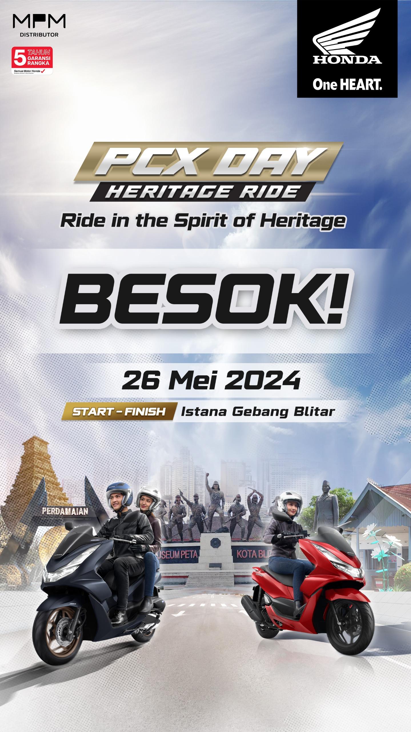 Dengan tema “PCX Day Heritage Ride”, PCX Day 2024 ini digelar di Istana Gebang Blitar. Beragam kegiatan akan memeriahkan PCX Day 2024 ini seperti City Riding yang diikuti oleh Ratusan pecinta Honda PCX dengan mengunjungi berbagai tempat heritage Kota Blitar. Selama kegiatan berlangsung, MPM Honda Jatim bersama jaringan dealer Honda akan memberikan program pembelian menarik yakni diskon uang muka Rp 1 juta dan diskon angsuran Rp. 50 ribu atau 3x tenor.